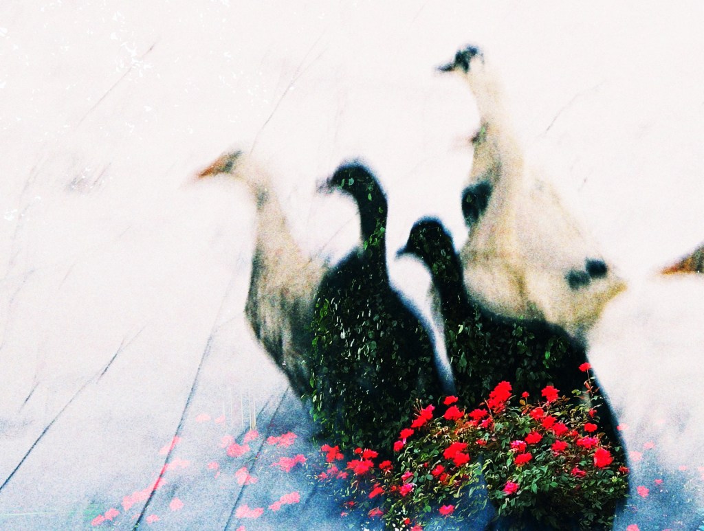 The photographs in the Geese collection consist of rhythmic spots circulating around goose patterns. In photographs, geese move randomly, creating plays of light as unpredictable compositions are separated into pattern layers. This mysterious world feels unsettlingly uncertain but has a strong and childlike acting.
