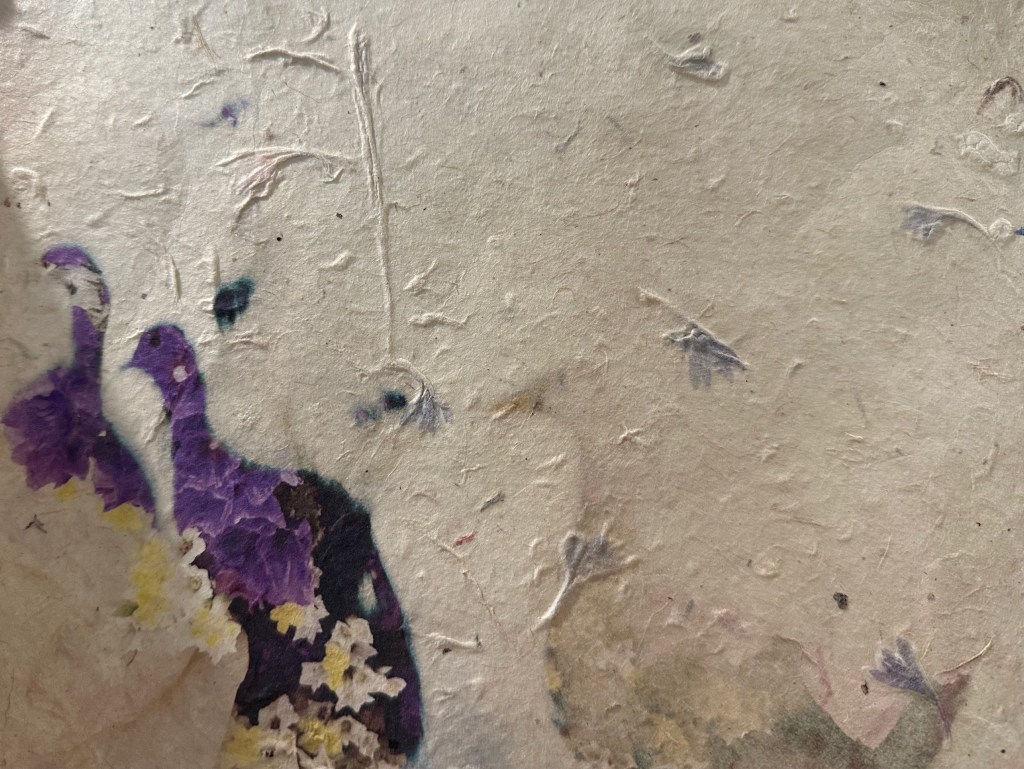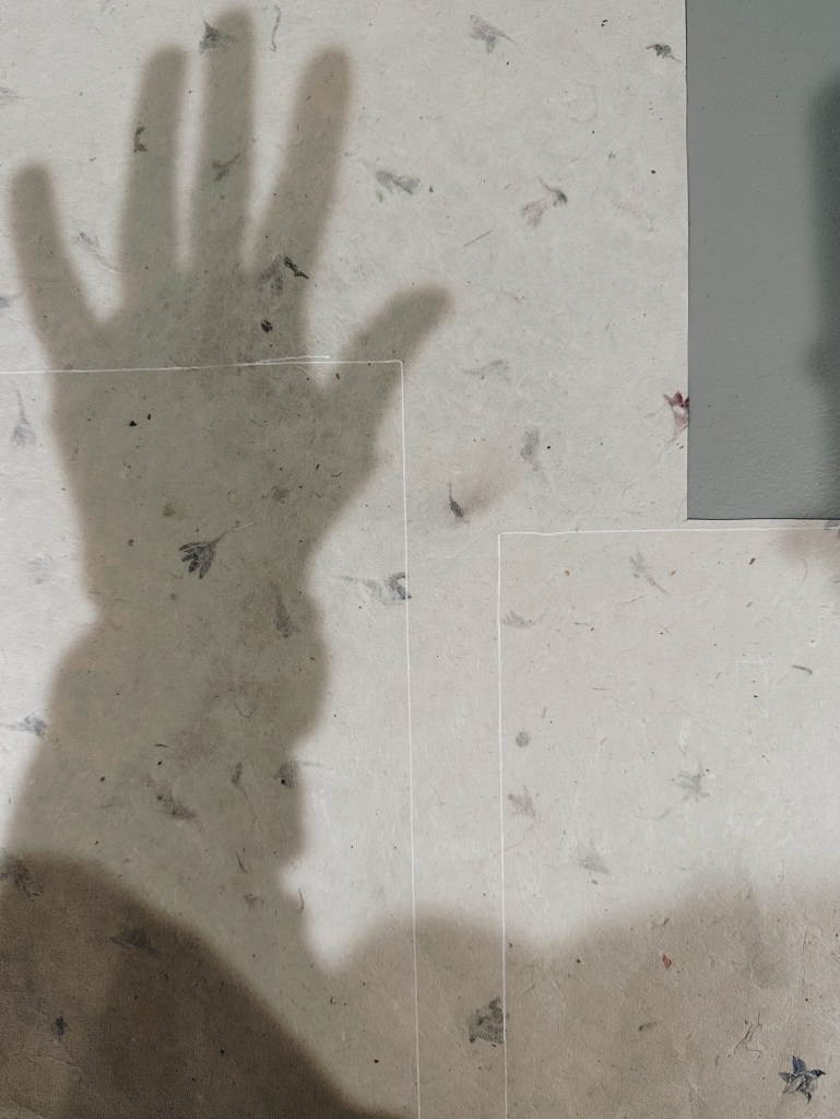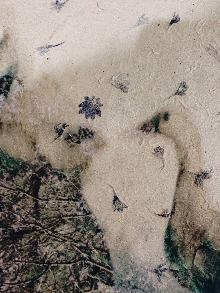 Taşınırken kaybettiğim şeylerden biriydi bu kağıtlar. Sonra nerden aldığımı anımsayıp yeniden aldım. Çünkü dokular konusunda sınır yok biliyorsun. Sonra kestim biçtim. Bugünlük, İki farklı boyut denedim. Sevdim. Kagıdın içindeki çiçeklerden bir örnekle görsel seçimi yaptım ee böylece kagıdı bütünleştirdim. Bu da bugünün denemesi oldu.